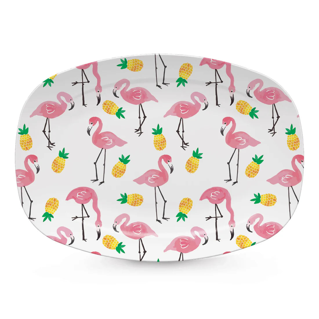Celebrate the spirit of the tropics and make every meal a mini-vacation with this charming Flamingos and Pineapples Platter! Cheerful pineapples and whimsical flamingo add a fun and festive touch to any gathering. TRAYchic is like melamine, but better. Microwave, oven, and dishwasher safe. BPA-free, formaldehyde-free and FDA approved for food. Made exclusively in the USA.