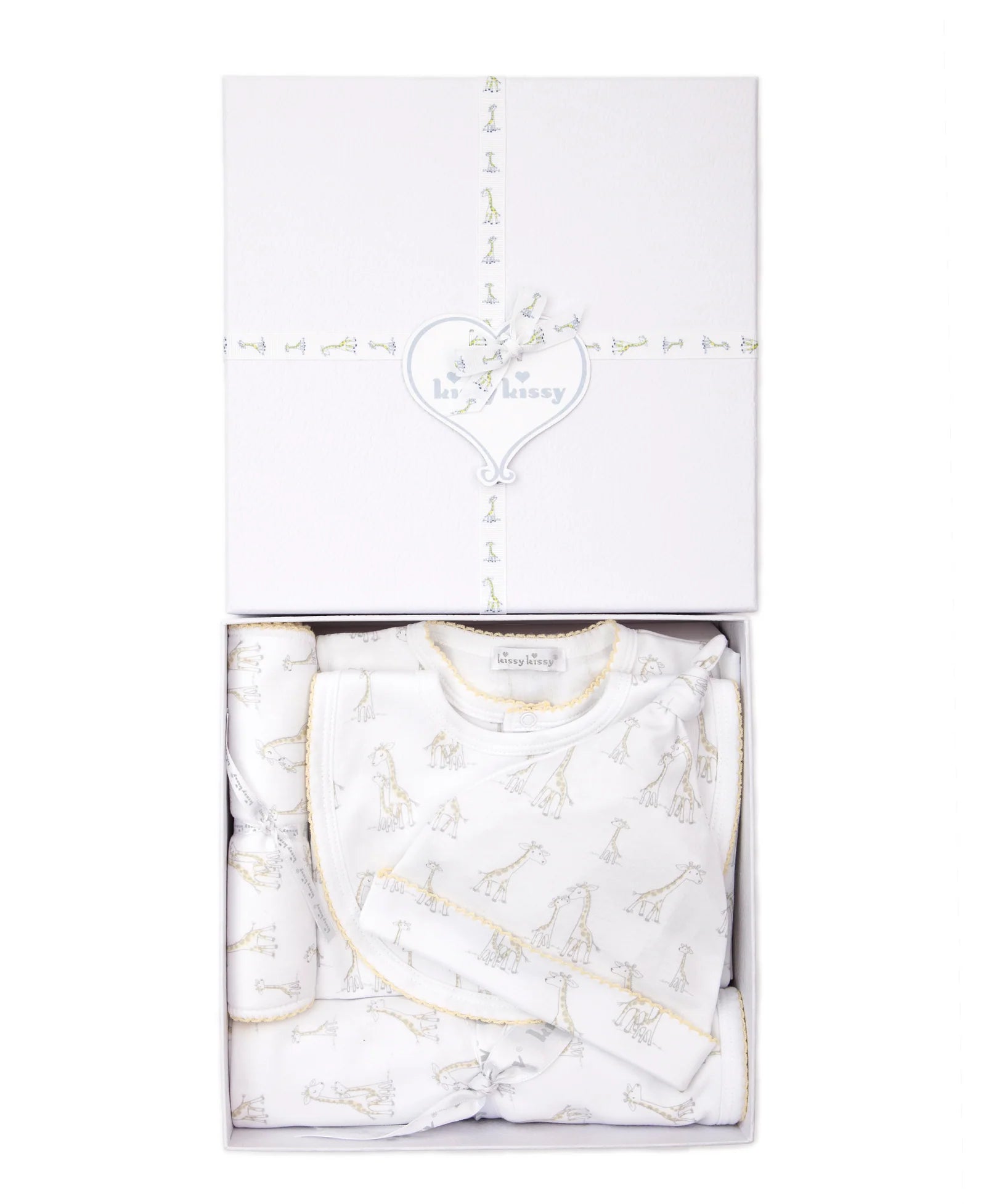 - Welcome baby home with this 100% Pima cotton, Kissy Kissy favorite: Giraffe Generatios Collection print gift set. This 5-piece take me home gift set includes a footie for sleep or play with a matching cozy hat, a bib & burp cloth and a coordinating, softer than softer heirloom quality blanket. All items are elegantly folded and placed in our branded gift box, wrapped in printed ribbon detail.