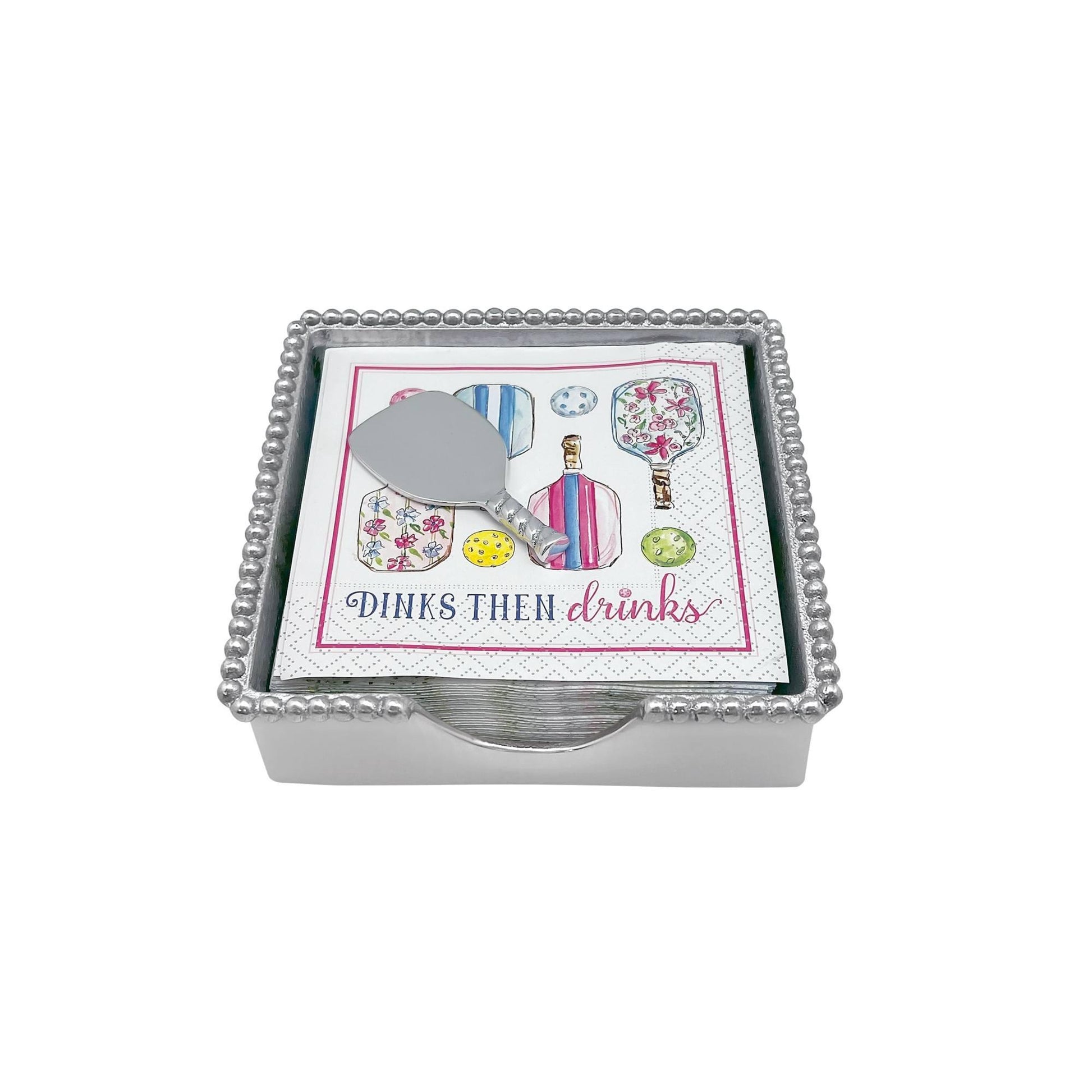 Serve up style with our Pickleball Beaded Napkin Box Set. Handcrafted from 100% recycled aluminum, this playful set includes a beaded napkin holder, a sculpted pickleball paddle napkin weight, and coordinating napkins with playful cocktails . A winning addition to any gathering—perfect for courtside entertaining or gifting to your favorite pickleball enthusiast.