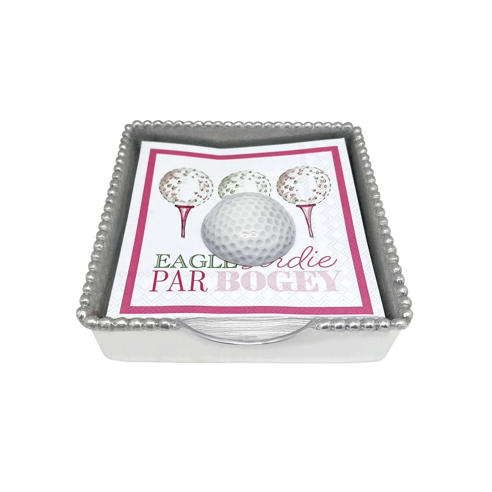 The classic design of our White Golf Ball Beaded Napkin Box is a perfect gift for golf lovers. A crisp White Enamel Golf Ball Napkin Weight rests on a stack of "Eagle Birdie Par Bogey" cocktail napkins. Our Beaded Napkin Box is handcrafted from 100% recycled aluminum.