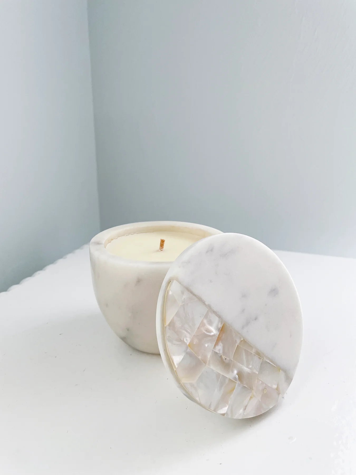 Our White Marble Lemongrass Candle is carefully crafted with 100% Soy Wax, infused with the delightful essence of lemongrass. The Mother of Pearl detailing showcases a natural iridescent white hue with subtle golden accents, creating a truly enchanting ambiance. Extend the life of this exquisite marble vessel and make it a timeless addition to your decor for years to come.